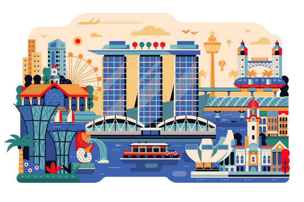 Singapore cityscape with famous landmarks and tourist symbols in geometric design.